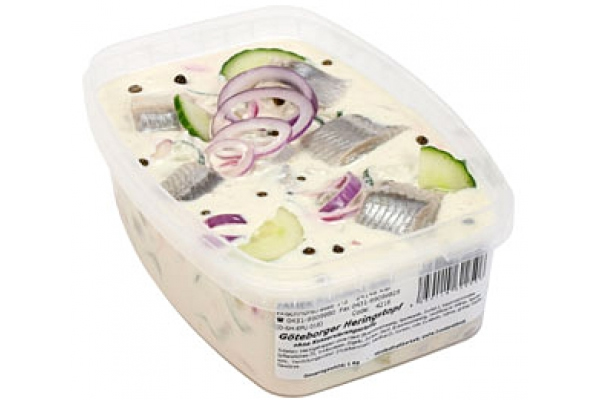 Zarte Heringshappen ohne Haut, frische grüne Gurken, grüner Pfeffer, Mayonnaise