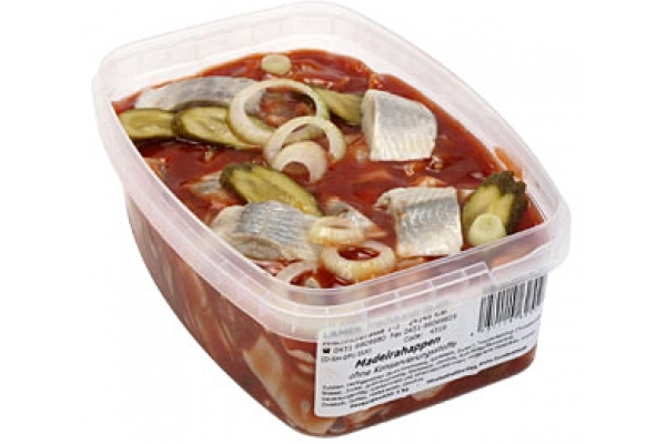 Süße Heringshappen ohne Haut, Gurken, Zwiebeln, Madeira-Sauce