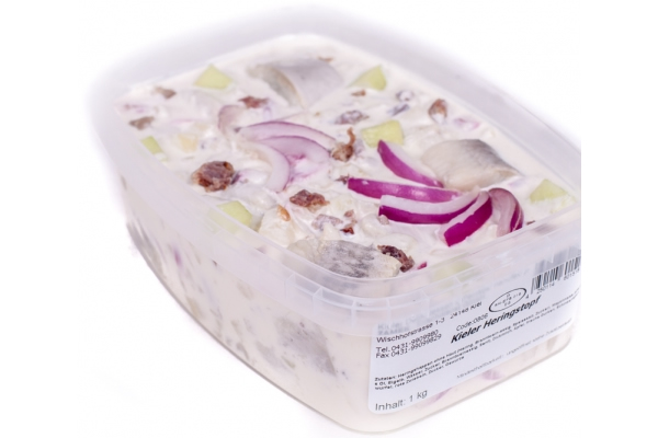 Heringshappen ohne Haut, Äpfel, Gurken, Speckwürfel, rote Zwiebeln, Mayonnaise