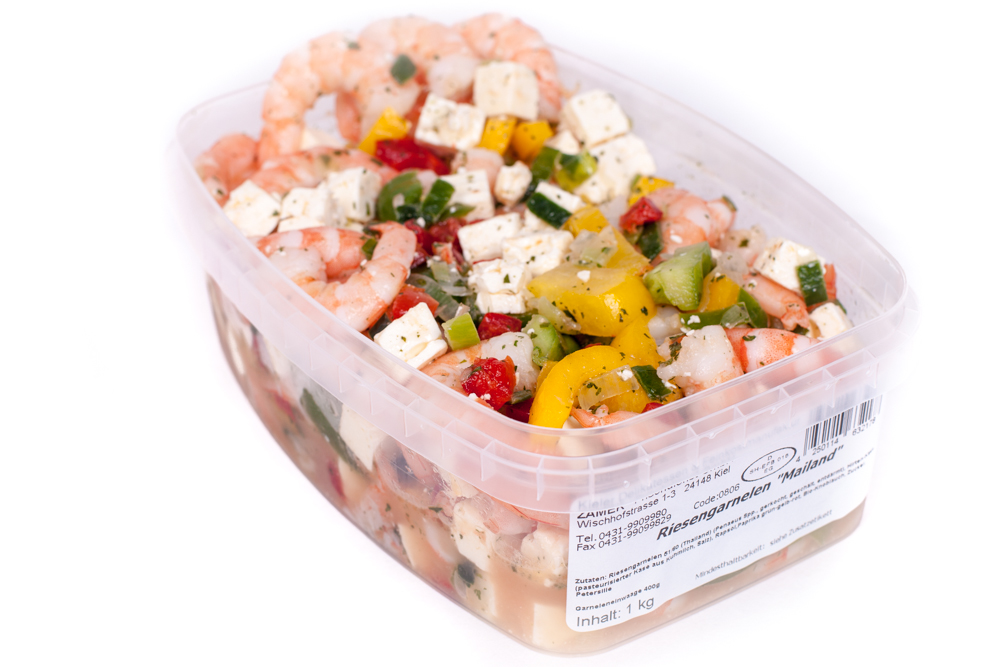 Riesengarnelen (40%), Hirtenkäse, Paprika bunt, Porree, Knoblauch, Petersilie, Speiseöl