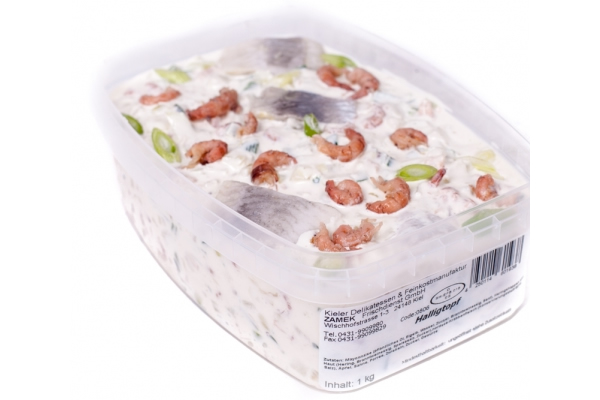 Zarte Heringshappen ohne Haut, Krabbenfleisch, Äpfel, Porree, Zwiebeln, Sahne, Mayonnaise