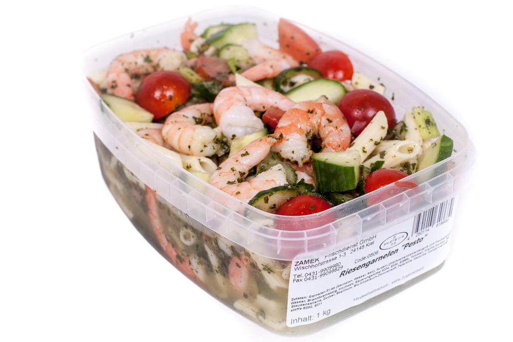 Riesengarnelen (55%), Nudeln, frische Gurken, Tomaten, Porree, Knoblauch, Petersilie, Speiseöl